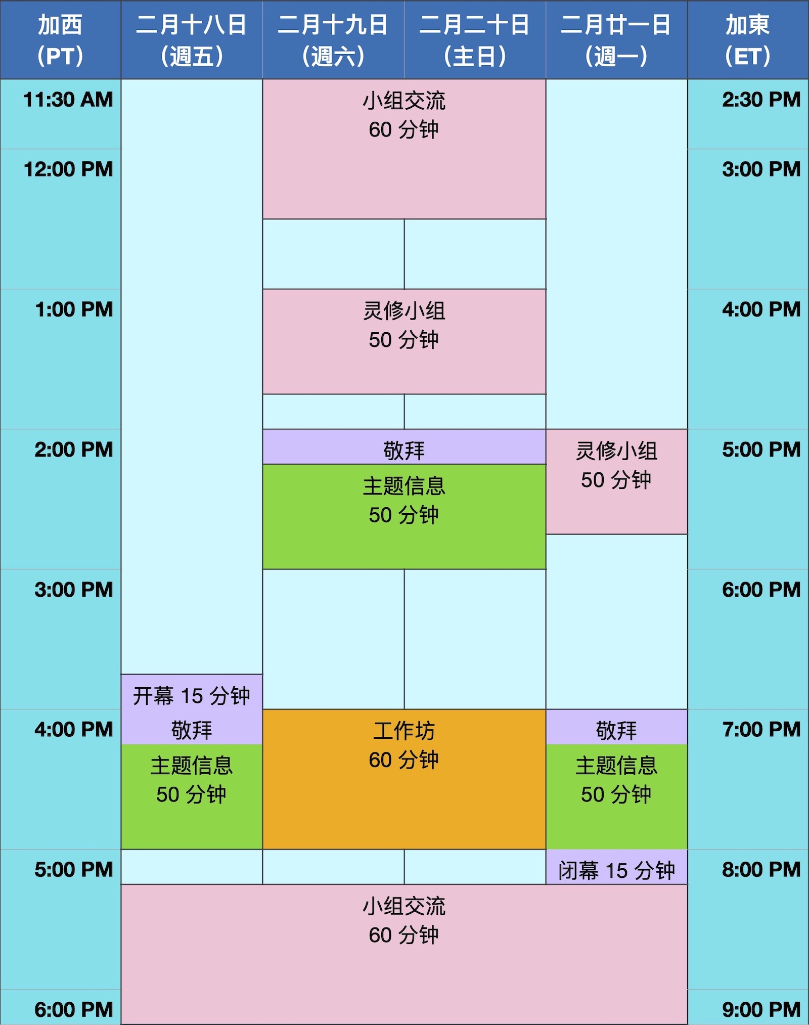| 日期 | 2月18~21日 (周五~周一) 时间表 |
