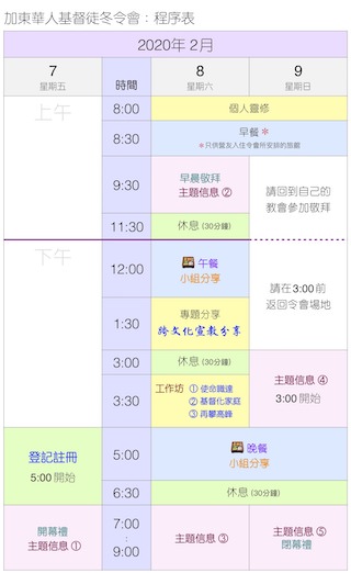 | 內容 | 主題信息、宣教分享、工作坊、兒童節目 |