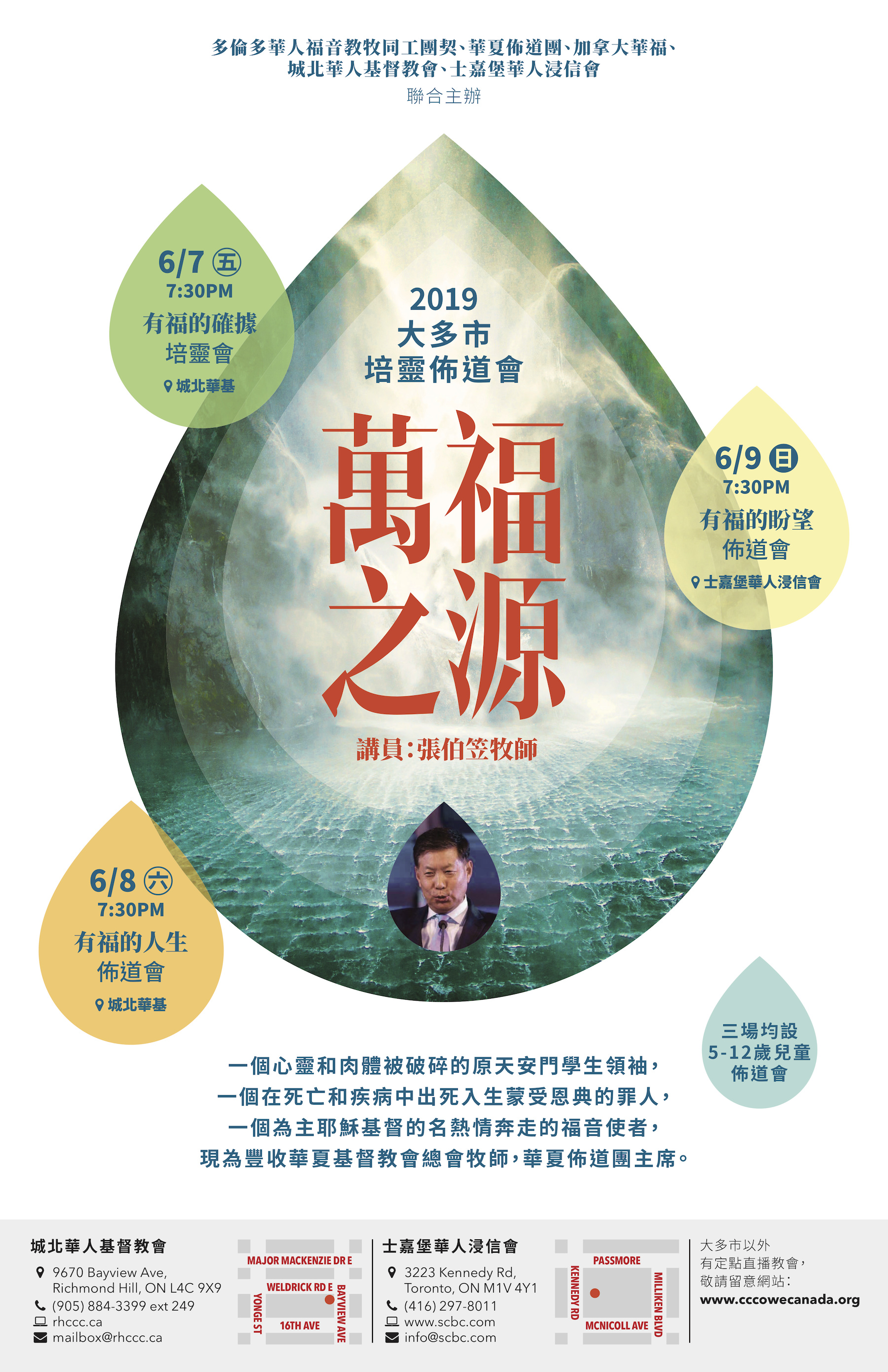 | 地點 | 城北華人基督教會 (6月 7~8日) 9670 Bayview Ave, Richmond Hill 士嘉堡華人浸信會 (6月 9日) 3223 Kennedy Rd, Toronto 大多市以外定點直播教會: